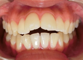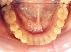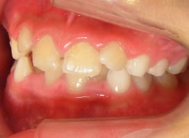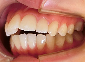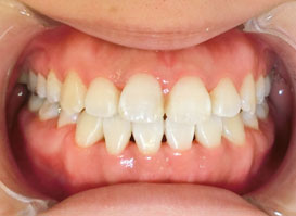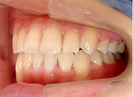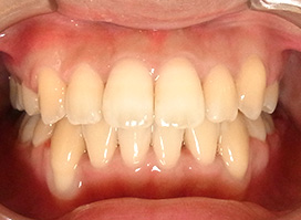 初診時は上の前歯が過度に出ていて、お顔を横から見ると、唇を閉じても前歯が見えており、 お口元の突出感がありました。また、噛み合わせが深く、下の前歯が上の歯肉を噛んでいました。