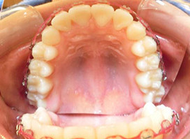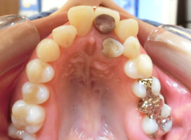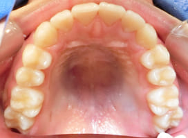 - 治療内容:上の左右第二小臼歯(5番目の歯)が大きく捻転し、口蓋部分に転位していました。非抜歯でマルチブラケット装置にて治療しました。